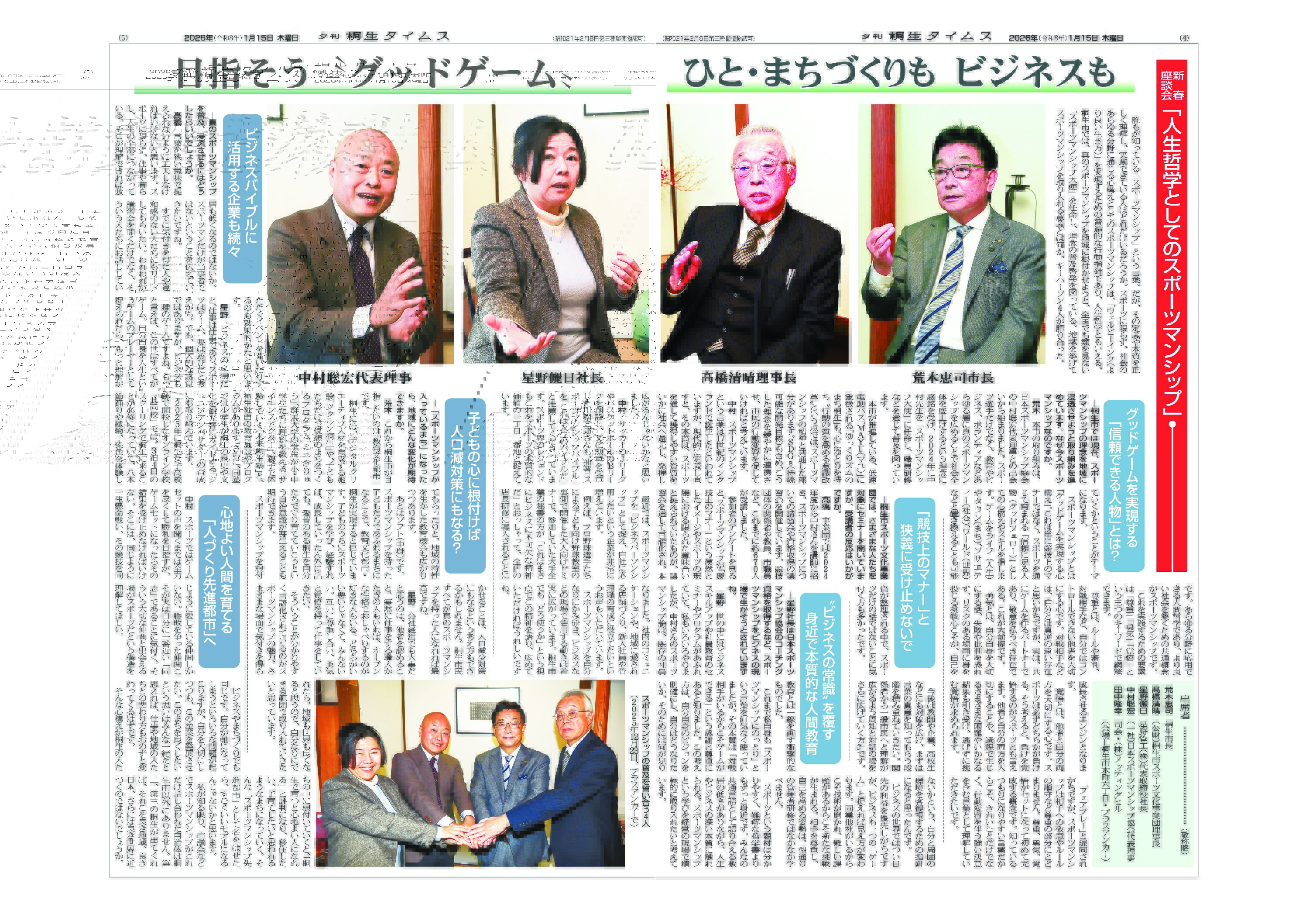 1月15日(木)の桐生タイムスで、新春座談会として「人生哲学としてのスポーツマンシップ」が特集・掲載されました。