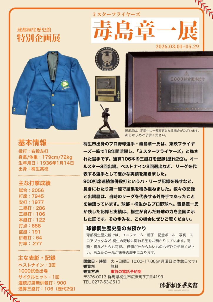 球都桐生歴史館では、3月1日から「ミスターフライヤーズ 毒島章一展〜暴れん坊球団「東映フライヤーズ」をまとめていた男〜」が開催されます。昨年8月に開館してから、記念すべき初の特別企画展となります。