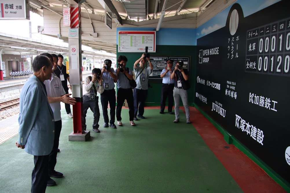 王代表は新桐生駅の2番ホームに降り立つと、野球場を模した一帯を視察します。1945年11月24日に行われた「全(オール)桐生」がプロ野球東軍に勝利したスコアが記されたエリアを見た際には、その舞台であった新川球場にまつわる話題に。